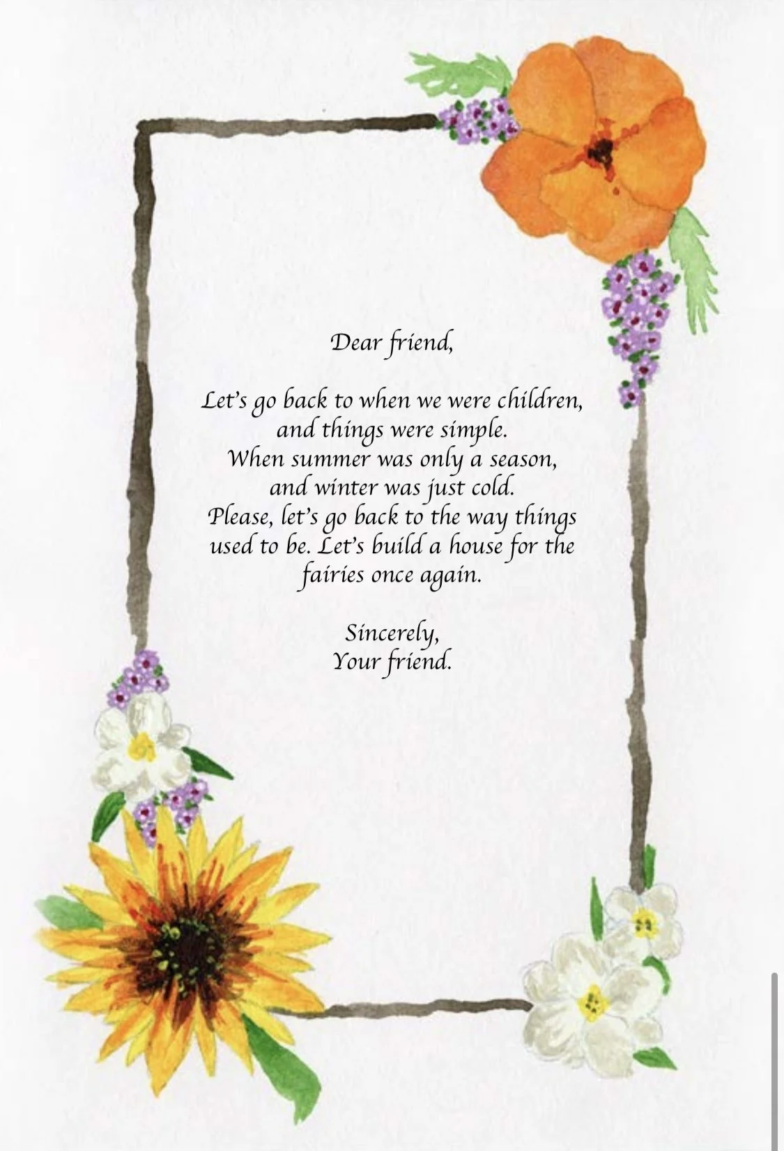 This story is dedicated to an old friend of mine, a friend that I miss very much. We used to build fairy houses together when we were kids, and I miss that simplicity.